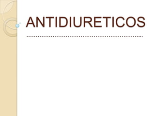 Los antidiuréticos son drogas que actúan sobre el riñón y reducen la secreción de orina. Incluyen la hormona antidiurética o vasopresina, las tiazidas y la clorpropamida. La vasopresina se extrae del lóbulo posterior de la hipófisis y disminuye la secreción de orina al aumentar la reabsorción de agua en los túbulos renales. Se usa para tratar la diabetes insípida administrándola por vía nasal o parenteral.
