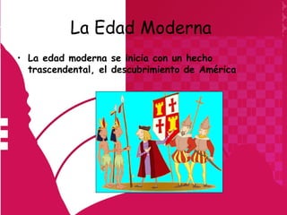El documento resume los principales eventos y cambios en España durante la Edad Moderna, incluyendo el descubrimiento de América, el aumento del poder real bajo los Reyes Católicos, el Renacimiento, el Barroco y la Ilustración, así como los reinados de los Borbones en el siglo XVIII y las reformas que llevaron a cabo.