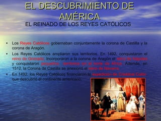 Los Reyes Católicos financiaron la expedición de Cristóbal Colón en 1492 que descubrió el continente americano. Tras la conquista de grandes imperios como los incas y los aztecas, los españoles organizaron América en virreinatos y explotaron sus recursos. Sin embargo, los costos de las guerras y la pérdida de territorios llevaron a la fragmentación del imperio hispánico en el siglo XVII.