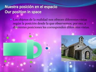 Este documento trata sobre la representación de objetos y puntos en el espacio y en planos. Explica que los objetos se ven de manera diferente dependiendo de la posición desde la que se observan y que los giros en el espacio se miden en ángulos. Además, introduce el uso de ejes de coordenadas para representar puntos en un plano mediante pares de números y la noción de escala para expresar la relación entre medidas en un plano y en la realidad.