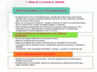 La civilización romana se desarrolló en torno al mar Mediterráneo, llamado "Mare Nostrum" por los romanos. Roma comenzó como una ciudad estratégicamente ubicada en la península itálica y eventualmente conquistó territorios en Europa, África y Asia, dividiéndolos en provincias gobernadas por un sistema político que evolucionó de la Monarquía a la República y luego al Imperio.