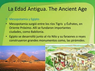 El documento resume la historia de la Edad Antigua y la Edad Media en España. La Edad Antigua incluyó las civilizaciones de Mesopotamia, Egipto, Grecia y Roma, las cuales influyeron en la Península Ibérica a través de los iberos, celtas y colonizadores fenicios y griegos. La Edad Media comenzó con la llegada de los visigodos y continuó con la conquista musulmana en el siglo VIII y la posterior reconquista cristiana que culminó en 1492.