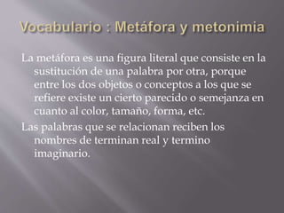 Este documento define y explica las figuras literarias de la metáfora y la metonimia. La metáfora sustituye una palabra por otra debido a una semejanza entre los dos objetos o conceptos. La metonimia designa una cosa con el nombre de otra debido a una relación entre ellas, como el instrumento y la persona, el autor y la obra, o la parte y el todo. También discute las lenguas oficiales en las diferentes comunidades autónomas de España, señalando que algunas son bilingües y que todas menos el eusk