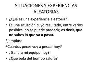 Este documento presenta conceptos clave sobre azar y probabilidad. Explica que una experiencia aleatoria es una situación cuyo resultado no se puede predecir con certeza, dando ejemplos como sacar una bola de un bombo o si ganará un equipo. Define los posibles resultados como sucesos y distingue entre sucesos seguros, posibles e imposibles. Muestra cómo calcular la probabilidad de un suceso dividiendo el número de posibles resultados favorables entre el total de resultados posibles. Finalmente, habla sobre estimar probabilidades a partir de datos histó