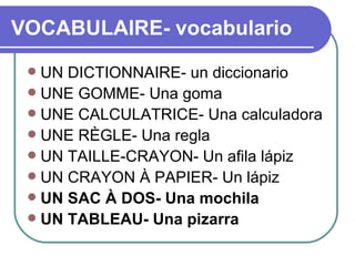 Este documento presenta una lista de vocabulario en francés relacionado con materiales escolares como diccionarios, lápices, borradores, calculadoras, mochilas, libros y cuadernos. También incluye información sobre los géneros de las nacionalidades y los colores. Por último, presenta los días de la semana en francés y el verbo ser/estar en dicho idioma.