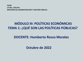 Este documento presenta una introducción a las políticas públicas. Explica que las políticas públicas son las decisiones que toma el gobierno para adoptar o no adoptar programas de acción. También analiza los modelos de relación entre políticos y funcionarios públicos en la elaboración de políticas, así como los diferentes enfoques sobre qué son las políticas públicas. Finalmente, discute la importancia de gobernar con políticas públicas en lugar de solo con política.