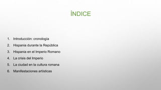 El documento proporciona un resumen de la presencia romana en la Península Ibérica. Explica que Roma conquistó la península en diferentes etapas, dividiéndola eventualmente en tres provincias. También describe aspectos clave de la economía, religión, organización política y vida urbana durante el período romano. Finalmente, resume algunas de las principales manifestaciones artísticas romanas como calzadas, acueductos, teatros y termas.