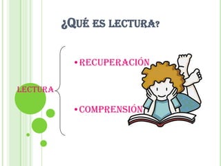 Este documento presenta información sobre la lectura y las técnicas de lectura. Explica que la lectura es una actividad humana que nos permite interpretar diferentes tipos de textos. Luego describe los pasos básicos de la lectura y diferentes tipos de lectura como la secuencial, intensiva y puntual. Finalmente, cubre varias técnicas de lectura como la velocidad de lectura, lectura diagonal y escaneo.