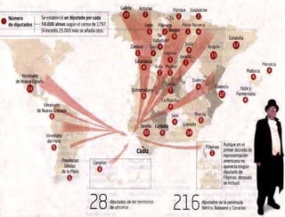 Las Cortes de Cádiz crearon un nuevo orden político y jurídico en España al establecer la soberanía nacional, poner fin al origen divino de la autoridad real y elaborar la Constitución de 1812. Las Cortes, compuestas principalmente por liberales, se reunieron en Cádiz en 1810 para representar a la nación y redactar una constitución que definiera los nuevos principios de igualdad, división de poderes y derechos de los ciudadanos.