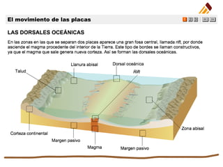 Este documento describe la estructura interna y la superficie de la Tierra, así como los procesos geológicos que dan forma al relieve terrestre. Explica que la Tierra está compuesta de corteza, manto y núcleo, y que la superficie se divide entre océanos y continentes. Además, detalla las diferentes formas de relieve, tanto en los continentes como en los océanos, y cómo se forman a través de la deriva de placas tectónicas, plegamientos, fallas, volcanes y terremotos. Por