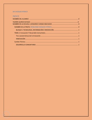 Este documento presenta información sobre innovación y desarrollo comunitario. Define innovación, cambio técnico y desarrollo comunitario, y describe algunas de sus características clave. Explica que la innovación no se limita a nuevos productos o tecnología, sino que también incluye cambios. Define el cambio técnico como la introducción de nuevos métodos y productos para aumentar la productividad. Finalmente, describe el desarrollo comunitario como un enfoque para mejorar el bienestar de las personas a través de la organización com