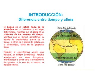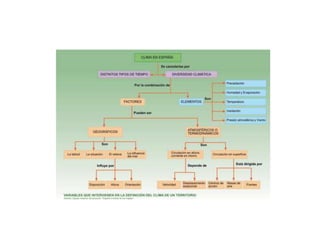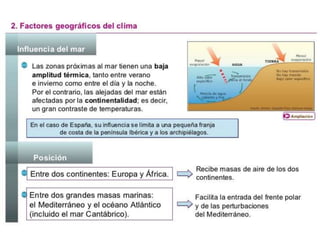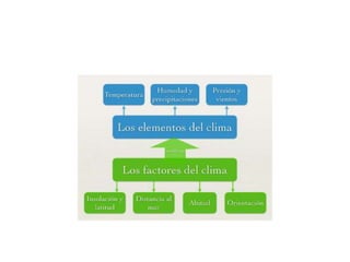 Este documento describe los principales factores geográficos que influyen en el clima de una región. Explica que la zonalidad, latitud, proximidad al mar, altitud y orientación de las montañas afectan la cantidad de radiación solar recibida, las corrientes marinas, y el movimiento de las masas de aire, lo que determina las características del clima como temperatura y precipitaciones.