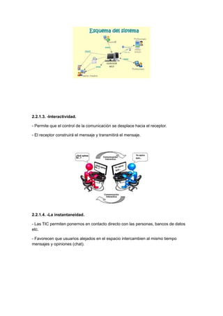 Este documento describe tanto las posibilidades como las limitaciones del uso de las TIC en la educación. Entre las posibilidades se encuentran la inmaterialidad, interconexión, interactividad e instantaneidad que permiten las TIC, así como la creación de nuevos lenguajes y códigos expresivos. Sin embargo, también presenta limitaciones como la necesidad de formación del profesorado, problemas con los contenidos multimedia y distracciones de los estudiantes con las TIC. Además, no hay evidencia de que mejoren los resultados académicos y conllevan un alto