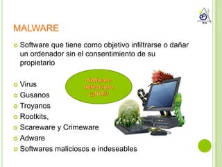 Este documento trata sobre seguridad informática y malware. Explica diferentes tipos de malware como virus, gusanos, troyanos, rootkits, scareware y crimeware. Indica que aproximadamente un tercio de los ordenadores en el mundo están infectados y que los troyanos son los más numerosos. También describe cómo funcionan los ataques distribuidos y ransomware/criptovirus.