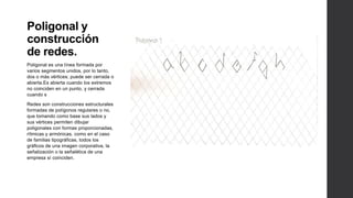 Este documento describe diferentes tipos de polígonos y cómo se pueden usar para construir redes. Explica que un polígono es una línea formada por varios segmentos unidos en vértices y puede ser cerrado u abierto. Luego describe triángulos, cuadrados, rectángulos, rombos, romboides, hexágonos y pirámides de base poligonal, incluyendo sus características geométricas clave. Finalmente, indica que las redes se construyen a partir de polígonos regulares o irregulares para crear formas pro