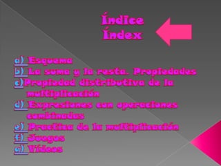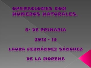 El documento resume las propiedades fundamentales de las operaciones con números naturales: la suma es conmutativa y asociativa, la resta es conmutativa, la multiplicación es conmutativa, asociativa y distributiva, y la jerarquía de las operaciones establece que se realiza primero la multiplicación y luego la suma y la resta.