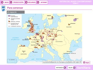 El documento describe los orígenes y la difusión de la Revolución Industrial en Inglaterra y Europa entre los siglos 18 y 19. Explica cómo factores como la revolución demográfica, la revolución agrícola y el desarrollo del comercio y transportes crearon las condiciones para que la Revolución Industrial surgiera primero en Inglaterra, impulsada por industrias pioneras como la textil y siderúrgica. Luego, la industrialización se difundió a Bélgica, Francia y Alemania, aunque cada país