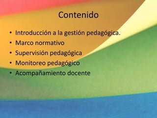 El documento aborda la gestión pedagógica, que incluye la planificación y movilización de recursos para alcanzar objetivos educativos. Detalla conceptos de supervisión, monitoreo y acompañamiento docente, enfatizando su importancia en la mejora continua de los procesos de enseñanza y aprendizaje. Se concluye que estas acciones son fundamentales para la calidad educativa y la evaluación del proceso educativo.