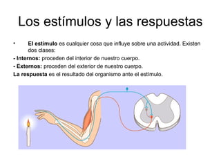 El documento describe los conceptos básicos de estímulos, respuestas y sistemas sensoriales. Explica que los estímulos pueden ser internos o externos y provocan respuestas musculares o glandulares. Describe los órganos sensoriales principales como los ojos, oídos, piel, nariz y lengua, y cómo cada uno capta diferentes estímulos. También resume la estructura básica del sistema nervioso, incluidas las neuronas, y cómo coordina los movimientos voluntarios e involuntarios del cuerpo.