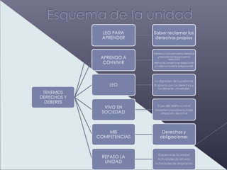 El documento trata sobre los derechos y deberes de las personas en una sociedad democrática. Explica que en una sociedad democrática todos tienen los mismos derechos ante la ley y están obligados a cumplirla. Define los derechos humanos como aquellos inherentes a todas las personas independientemente de su raza, sexo u otras características. Además, señala que los niños tienen derecho a la educación pero también el deber de aprovecharla.