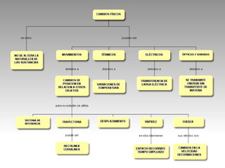 Este documento describe diferentes tipos de cambios físicos, incluyendo cambios térmicos, eléctricos, ópticos y sonoros. También describe el movimiento, incluyendo conceptos como trayectoria, posición, distancia recorrida, rapidez, fuerza e inercia. Define la fuerza como la causa capaz de modificar el estado de reposo o movimiento de los cuerpos.