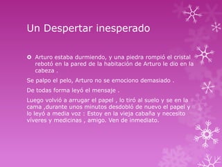 Una piedra rompió el cristal de la habitación de Arturo y le dio en la cabeza, despertándolo. Leyó una nota arrugada en el suelo que decía "Estoy en la vieja cabaña y necesito víveres y medicinas, amigo. Ven de inmediato".