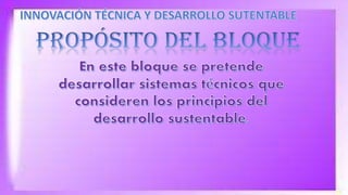 El documento trata sobre la innovación técnica sustentable. Explica que la innovación requiere modificar los sistemas técnicos para ofrecer soluciones más eficientes a los problemas ambientales, mediante el uso de nuevos materiales, técnicas de producción y formas de organización y consumo. El mayor reto es transferir estas tecnologías sustentables a todos los países para proteger el medio ambiente de manera responsable.