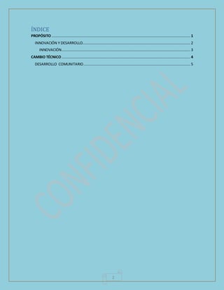 Este documento discute la innovación y el desarrollo técnico. Explica que la innovación implica la creación de nuevos productos, procesos, servicios o ideas que son aceptados por el mercado y la sociedad. También destaca que la innovación incluye la renovación de productos y procesos, así como cambios en la organización y las habilidades de los profesionales. Además, señala que el cambio técnico introduce transformaciones a través del reemplazo de productos, procesos y técnicas, y que la innovación