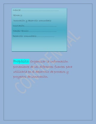 El documento trata sobre la innovación y el desarrollo comunitario. Explica que la innovación implica la implementación de nuevas ideas y soluciones a nivel local. También describe el cambio técnico como la introducción de nuevos métodos y productos para aumentar la productividad. Finalmente, resume que el desarrollo comunitario busca brindar servicios de salud y asistencia social a las personas que lo necesitan a través de proyectos multidisciplinarios.