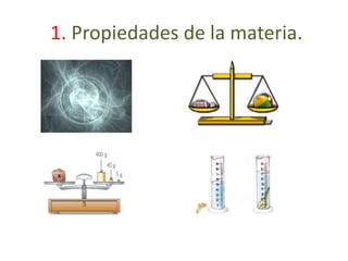 El documento trata sobre las propiedades de la materia. Explora cinco temas principales: 1) las propiedades de la materia, 2) el estado de la materia, 3) los cambios de estado, 4) la clasificación de los elementos como sustancias puras, y 5) la clasificación de la materia como mezclas.