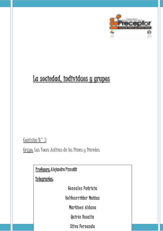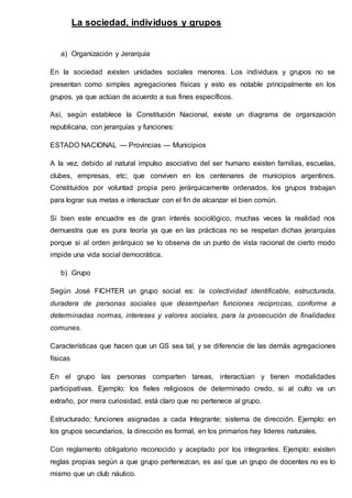 El documento describe diferentes aspectos de la sociedad, los individuos y los grupos. 1) Explica la jerarquía de la organización social en Argentina y los tipos de grupos que existen. 2) Define qué es un grupo social y sus características. 3) Distingue entre grupos primarios y secundarios y describe sus características.