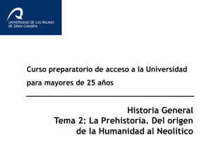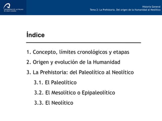 El documento es un curso preparatorio sobre la prehistoria, abarcando desde el origen de la humanidad hasta el neolítico. Se detallan las etapas de la prehistoria, incluyendo el paleolítico, mesolítico y neolítico, junto con la evolución del género Homo y los desarrollos culturales y tecnológicos de cada periodo. Además, se enfatiza la transición hacia una economía productiva y la sedentarización en la revolución neolítica.