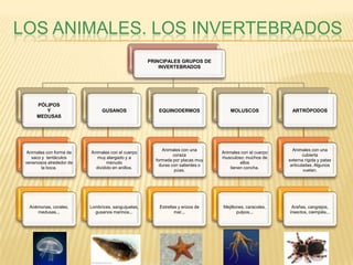 Este documento describe los principales grupos de invertebrados y vertebrados. Explica que los invertebrados se dividen en polpos y medusas, gusanos, equinodermos, moluscos y artrópodos. Los vertebrados se clasifican en peces, anfibios, reptiles, aves y mamíferos. También describe las funciones de nutrición, relación y digestión en los animales.