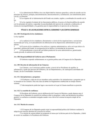 El documento presenta una serie de artículos de la Constitución Española relacionados con el gobierno y la administración pública. Describe la composición y funciones del gobierno, el proceso de nombramiento del presidente del gobierno y los ministros, y las circunstancias que pueden dar lugar al cese del gobierno. También cubre temas como la función pública, la responsabilidad del gobierno ante el parlamento, y los poderes del parlamento para interpelar y censurar al gobierno.