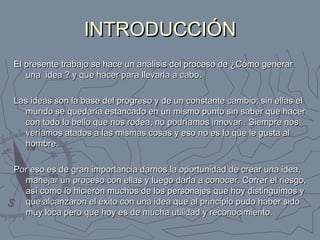 Este documento ofrece consejos para generar ideas de negocios. Explica que las ideas son la base del progreso y que siempre hay oportunidad de crear algo nuevo. Ofrece 14 pasos para generar ideas, como divertirse, pensar como un niño, obtener más información, combinar ideas existentes, definir problemas y poner la idea en acción. El objetivo es sacar la creatividad interna y arriesgarse a presentar nuevos proyectos.