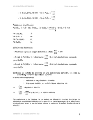 Este documento resume conceptos clave sobre coagulación en el tratamiento de agua potable, incluyendo: 1) métodos para determinar la dosis óptima de coagulante mediante ensayos de jarras, 2) principales tipos de coagulantes como sulfato de aluminio, sulfato ferroso y cloruro férrico, y 3) dispositivos para mezcla rápida como placas de orificio y resaltos hidráulicos que generan turbulencia para una mezcla efectiva.