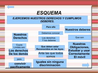 Este documento trata sobre los derechos y deberes de las personas en una sociedad democrática. Explica que en dichas sociedades todos tienen los mismos derechos humanos básicos independientemente de su raza, sexo u otros factores, los cuales están recogidos en la Declaración Universal de los Derechos Humanos. También menciona que los niños tienen el derecho a la educación pero también el deber de aprovecharla, y ofrece consejos sobre el uso apropiado del teléfono móvil sin molestar a otros o caer en adiccion