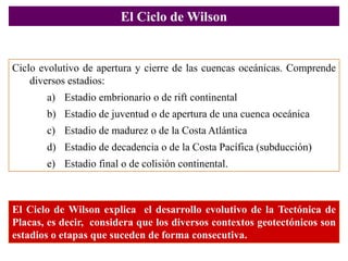 El Ciclo de Wilson describe las etapas del desarrollo y cierre de cuencas oceánicas: 1) la formación de un domo por un hotspot, 2) el inicio del rifting continental, 3) la apertura de una cuenca oceánica a medida que continúa el rifting, y 4) eventualmente la subducción y colisión continental cuando la corteza oceánica se hunde en la astenosfera.