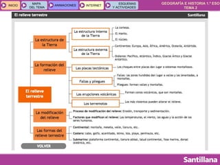 Este documento presenta información sobre la geografía física de la Tierra. Explica que la Tierra está compuesta de tres capas concéntricas - la corteza, el manto y el núcleo. Describe cómo la teoría de placas tectónicas explica cómo las placas se mueven y chocan, formando características del relieve como montañas, volcanes y terremotos. También discute cómo factores como el agua, el viento y la vida modifican lentamente el relieve a través de la erosión, el transporte y la