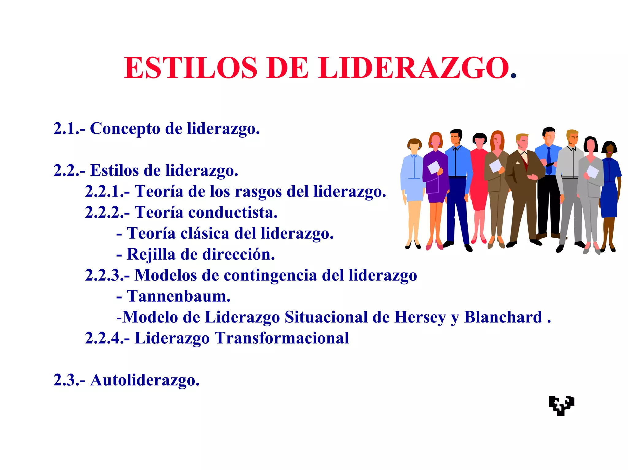 Este documento describe diferentes estilos de liderazgo. Presenta teorías como la de los rasgos del liderazgo, la teoría conductista, y modelos de contingencia como los de Tannenbaum, Hersey-Blanchard y Fiedler. También cubre el liderazgo transformacional y el concepto de autoliderazgo.