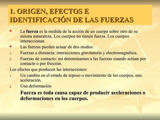 Este documento describe los conceptos básicos de la estática y el equilibrio de fuerzas. Explica que una fuerza es la interacción entre dos cuerpos, y que pueden ser fuerzas de contacto o a distancia. También define la resultante y descomposición de fuerzas, y establece que para que un cuerpo esté en equilibrio la suma de fuerzas y momentos sobre él debe ser cero. Finalmente, resume las máquinas simples como palancas, planos inclinados y poleas.