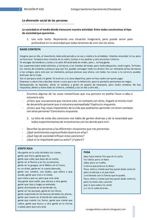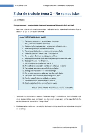 Este documento presenta información sobre las amistades y la dimensión social de las personas. Incluye una lista de características de un buen amigo, como aceptar a los demás, estar disponible cuando se necesita y respetar a los demás. También describe una situación imaginaria de una persona que se despierta y descubre que no hay nadie más, destacando lo solitario y aburrido que sería vivir sin otros. Finalmente, presenta las letras de dos canciones que hablan de la variedad de personas en la sociedad y la necesidad fundamental de