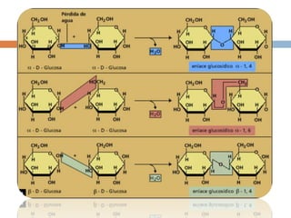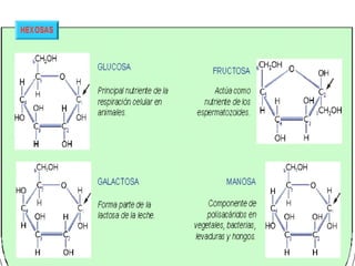 Este documento proporciona información sobre los glúcidos o carbohidratos. Explica que los monosacáridos son los glúcidos más simples y pueden usarse directamente como fuente de energía, mientras que los ósidos deben hidrolizarse primero. Describe la clasificación de los glúcidos en monosacáridos, ósidos y heterósidos. Resalta las propiedades de los monosacáridos como su poder reductor, solubilidad en agua y su presencia de isómeros funcionales y espac