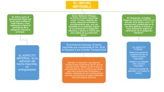 El documento define el hecho imponible como el presupuesto establecido en la ley que origina la obligación tributaria cuando ocurre. Explica que incluye el acto, situación o actividad especificada en la ley y analiza sus aspectos materiales, formales, temporales y locales. También describe los efectos de cuando el hecho imponible ocurre, incluyendo las obligaciones tributarias y las exenciones y exoneraciones contempladas en la ley.