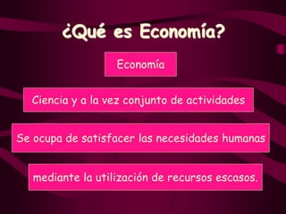 Este documento describe los conceptos básicos de la economía. La economía estudia cómo satisfacer las necesidades humanas mediante los recursos escasos disponibles. Explica que existen necesidades primarias y secundarias, y que las actividades económicas básicas son la producción, distribución y consumo de bienes y servicios. Además, identifica a las familias, empresas y estado como los principales agentes económicos.