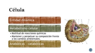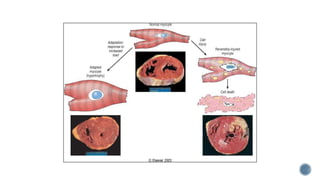 Este documento trata sobre temas relacionados con la biología celular y la patología. Describe los procesos de metabolismo celular, adaptaciones celulares como la hiperplasia, hipertrofia y atrofia. También explica las respuestas celulares al estrés como la necrosis, apoptosis y envejecimiento celular. Finalmente, analiza los mecanismos de muerte celular como la necrosis y sus diferentes tipos.