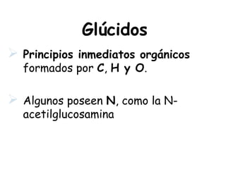 El documento trata sobre los glúcidos. Explica que son compuestos orgánicos formados por carbono, hidrógeno y oxígeno, a veces con nitrógeno. Describe las funciones de los glúcidos, incluyendo funciones energética, estructural y de reconocimiento celular. Además, clasifica los diferentes tipos de glúcidos como monosacáridos, disacáridos, oligosacáridos y polisacáridos.