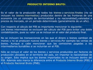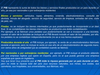 El PIB representa la suma de todos los bienes y servicios finales producidos en un país durante un año, ya sea por nacionales o por extranjeros residentes. Se calcula a precios de mercado y excluye los bienes intermedios para evitar doble contabilización. El PIB mide la producción pero no la riqueza total de un país y tiene limitaciones como no incluir la economía informal.