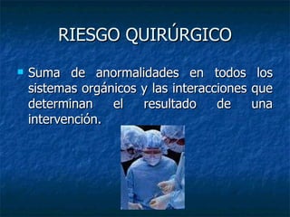 El documento describe los aspectos relacionados con la evaluación y manejo del riesgo quirúrgico en pacientes. Explica que el riesgo quirúrgico depende de las anormalidades en los sistemas orgánicos y las interacciones que determinan el resultado de una intervención. Luego detalla la evaluación de los principales sistemas como el cardiovascular, pulmonar, renal y hepático para identificar y reducir posibles complicaciones. Finalmente, enfatiza la importancia de una adecuada valoración preoperatoria del paciente.