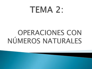 Este documento describe las propiedades y operaciones básicas con números naturales, incluyendo la suma, resta, multiplicación y expresiones combinadas. Explica las propiedades conmutativa, asociativa y distributiva, así como el uso de paréntesis y la jerarquía de operaciones. También incluye ejemplos prácticos de cómo aplicar estas propiedades y realizar cálculos con números naturales.